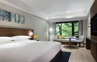 ウッド調の内装と木立のアートパネルで軽井沢の洗練されたムードを表現した32㎡のツインルーム。