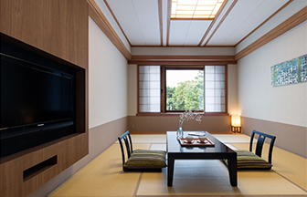 和の風情ただよう33㎡の客室。軽井沢の森を眺めながら、8畳の畳スペースでゆったりおくつろぎください。